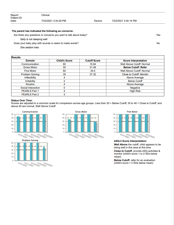 Parental concerns about their child’s development and behavior typically measured with the ASQ-3 and ASQ:SE-2 respectively need to be addressed. Postpartem depression on the part of the parent typically measured with the EPDS needs to be managed. Other screenings can be added to cover these measures and extend them to include parent & family priorities leading to a parent led agenda for the visit.